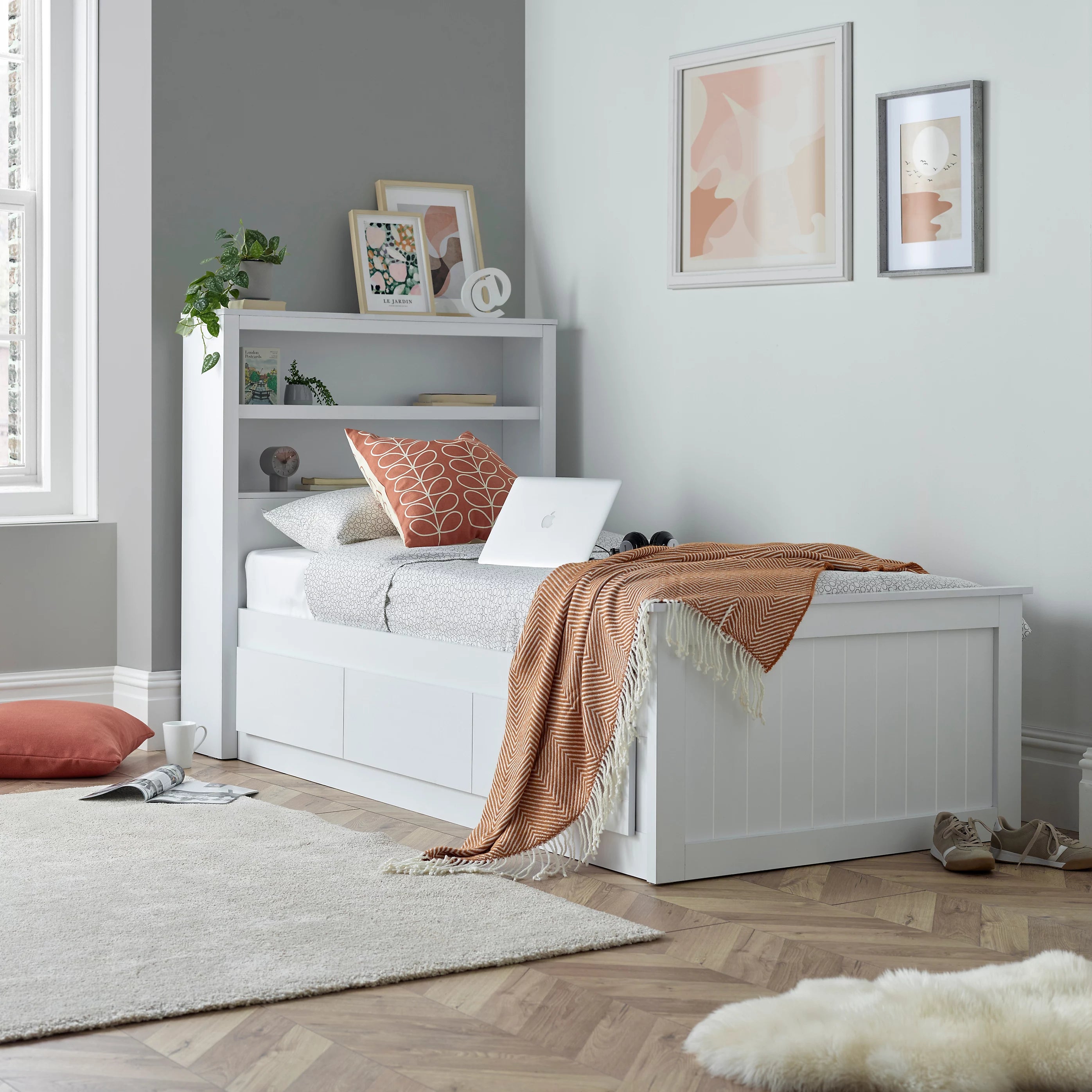 Featuring three spacious built in drawers, this bed provides ample storage for bedding, clothing, and personal belongings, helping to keep your bedroom neat and organised. The thoughtfully designed headboard includes two built in bookshelves, making it easy to keep your favourite books, night time essentials, or decorative pieces within reach.