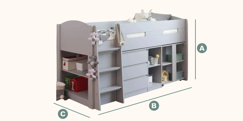 The Brucey Mid Sleeper Bed is a stylish, space-saving solution for children aged 6+. Available in grey or white, it combines modern design with practical features like a pull-out desk, drawers, and shelves. Ideal for both small and large rooms, its storage units can sit neatly underneath or be placed elsewhere. Safety is built in with solid sides, a secure rail, and wide ladder steps.