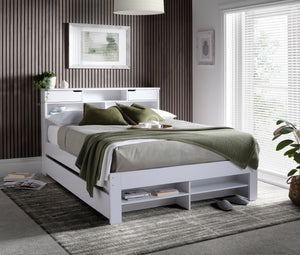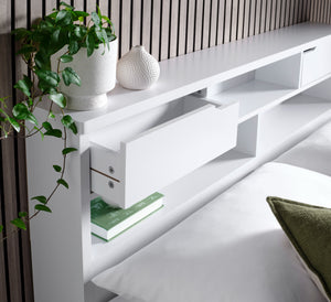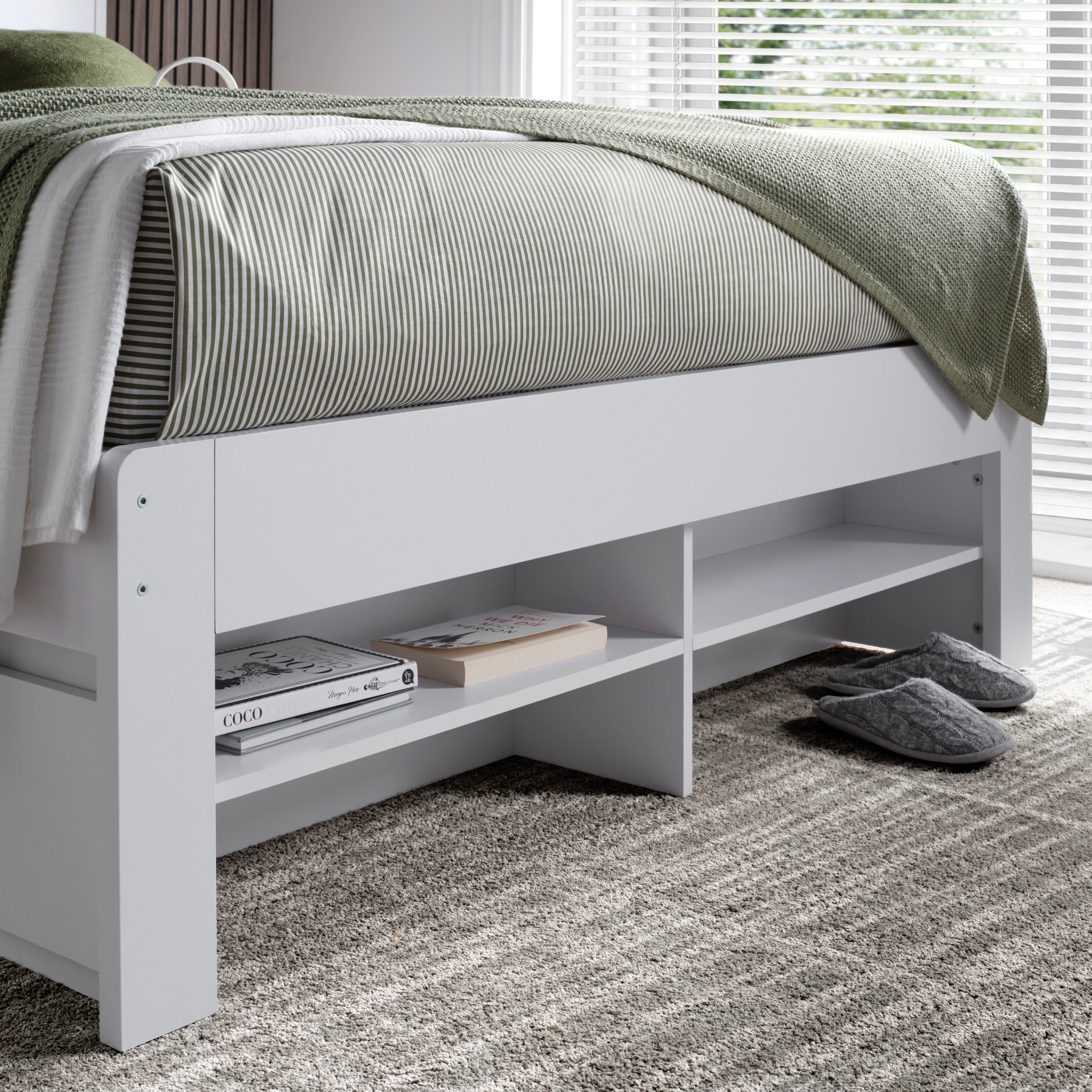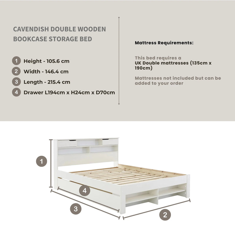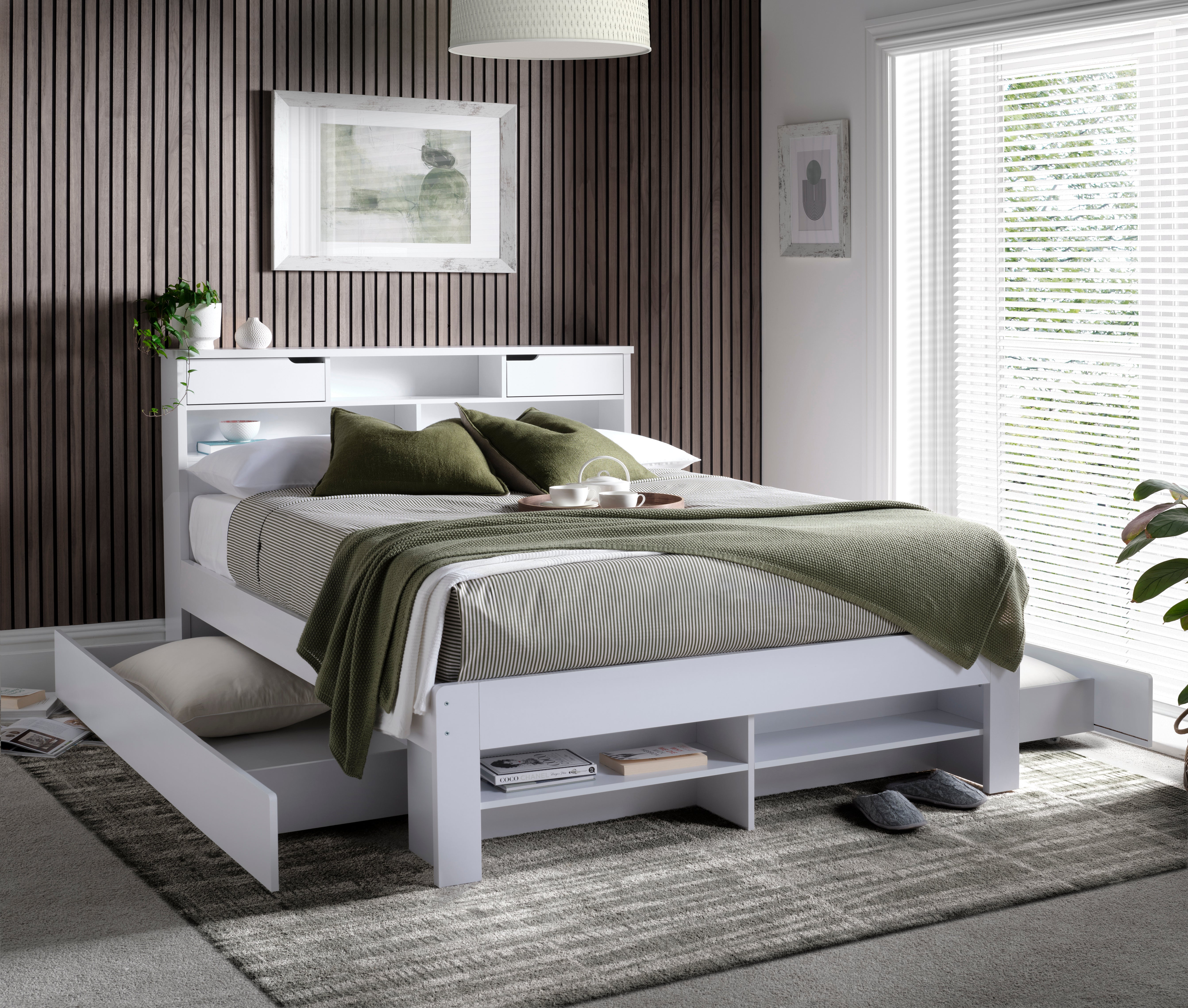 A dream come true for book lovers, beautifully blending practicality with understated elegance, the Cavendish Double Wooden Storage Bed is the perfect pick for any avid reader or tidy space-seeker. With a sleek, minimalist frame finished in a fresh white tone, this bed offers more than just a place to sleep, it cleverly integrates open shelving into both the headboard and foot end, ideal for displaying favourite books, treasured keepsakes, or bedtime essentials. A charming centrepiece for any bedroom, the Cavendish proves that simple design can still be wonderfully smart and stylish.