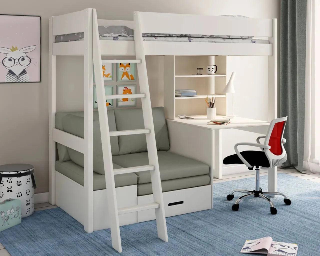 Underneath, the bed boasts a spacious built in desk with integrated shelving, ideal for studying, crafting, or gaming. To one side, you'll find a clever extendable futon chair bed that transforms into a full length single bed (approx. 190cm), great for sleepovers or guests. The chair bed also includes a hidden storage compartment beneath the seat, accessed by a hinged lift-up lid, ideal for tucking away bedding, books, or toys.