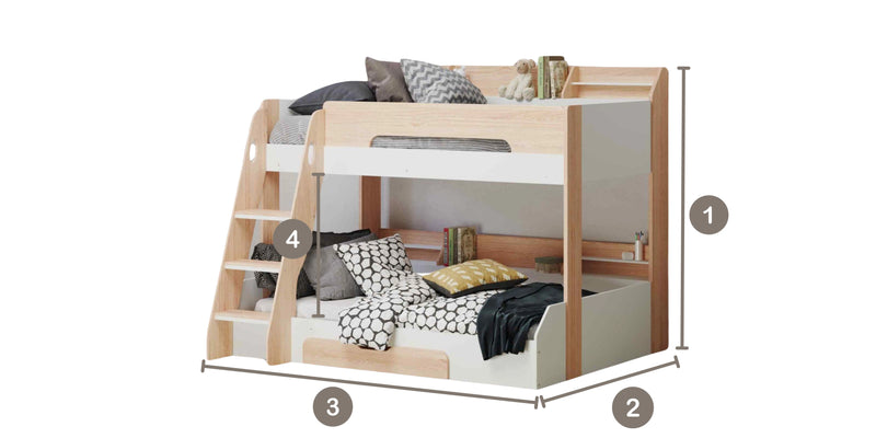 Kids will love the thoughtful design, with storage shelves fitted to both the top and bottom bunks for keeping books, toys, and bedtime essentials close at hand. A handy storage drawer on the bottom bunk provides additional space for bed sheets or other items, helping to keep the room organised and clutter-free.