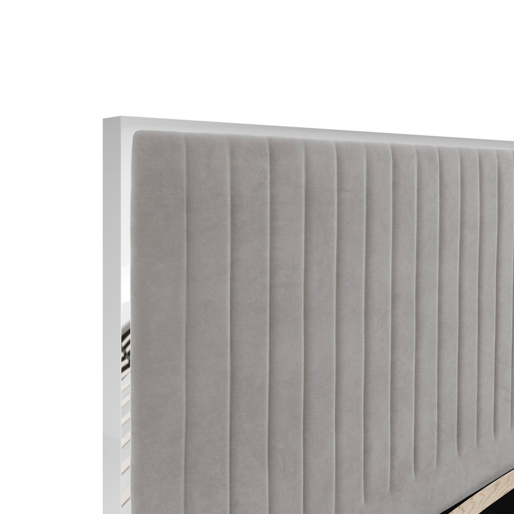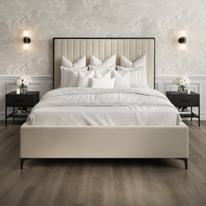 The Hertford Velvet Bed features plush cream velvet upholstery and a sleek matte black metal headboard surround. Its tall fluted headboard design creates a striking focal point, while the neutral monochrome colorway ensures it complements any decor. Finished with a sprung slatted base for added comfort.