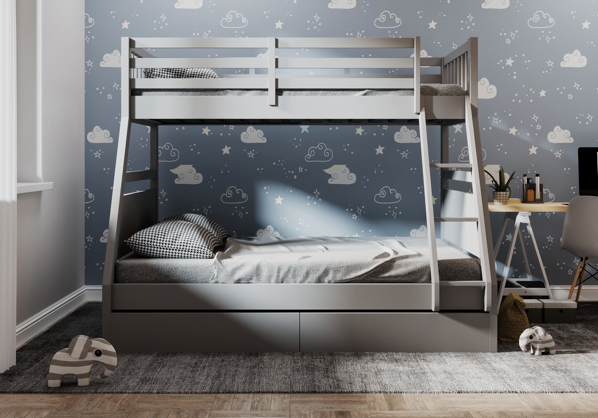 Available in white or grey with classic pine slatted headboards, it blends timeless design with practicality. Safe angled ladder steps and two integrated storage drawers make it both functional and family-friendly, the perfect space-saving choice for siblings or guests.