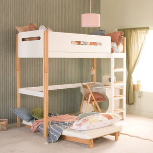The Edit Loft Bed with futon and desk features a carefully crafted bedframe made from solid hardwood; designed to bring style and versatility to compact spaces. With sleep, study, gaming, and relaxation all seamlessly integrated, it offers everything older children, teens, or guests need, all within the footprint of a single bed.