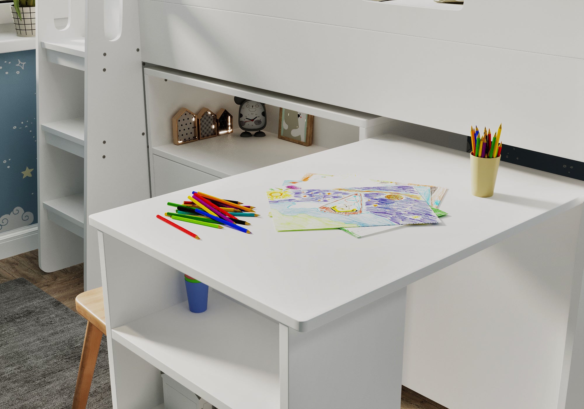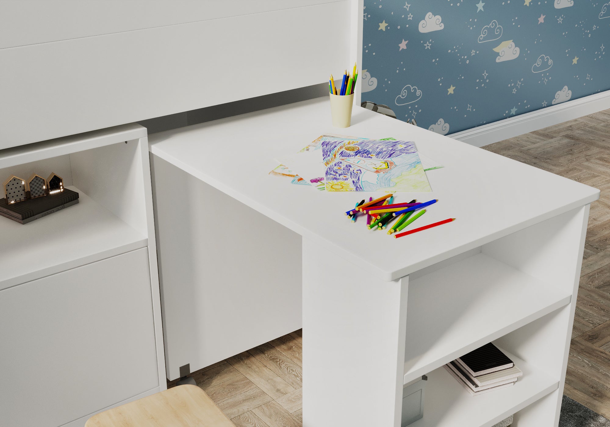 With built in storage, including an integrated cupboard with a spacious shelf and additional open shelving, there’s plenty of room for books, toys, games, and clothing. The pull out desk on wheels offers a dedicated workspace for learning and creativity and can be easily tucked away when not in use. A built in bookcase at the end of the desk adds even more storage for essentials.