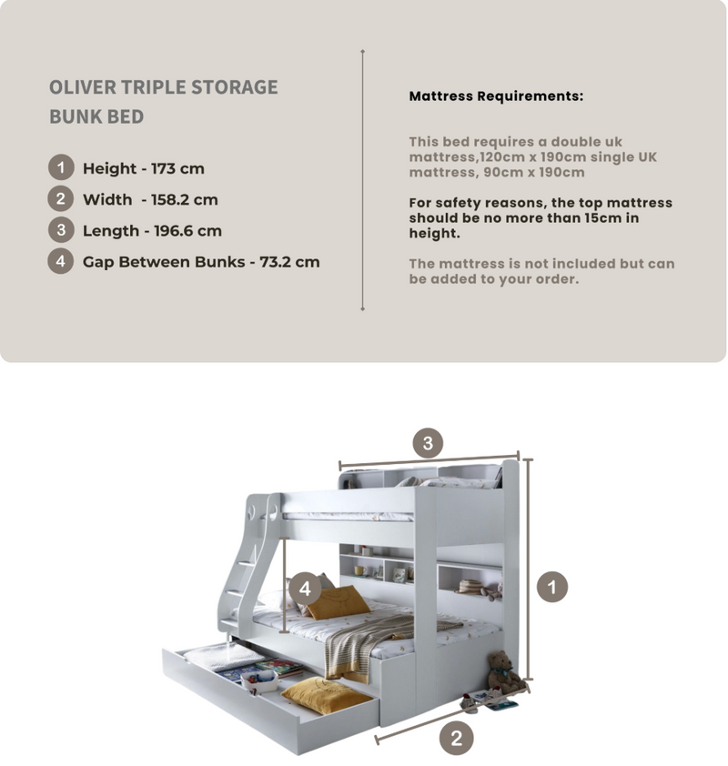 The Oliver Triple Sleeper is the perfect blend of modern design, versatility, and functionality, making it an ideal choice for shared bedrooms, guest rooms, or sleepovers. With a contemporary white finish, this bunk bed provides ample sleeping space while incorporating smart storage solutions to keep the room organised and clutter-free.