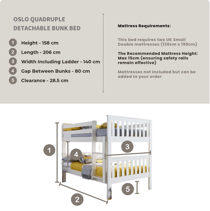 With its modern, gapped design and high quality finish, the Oslo Quadruple Bunk Bed complements any bedroom style while maximising floor space. Delivered flat packed for easy transport and assembly, this bed is the ultimate space saving solution for growing families, shared rooms, or guest accommodations.