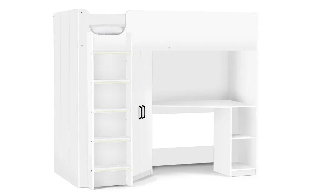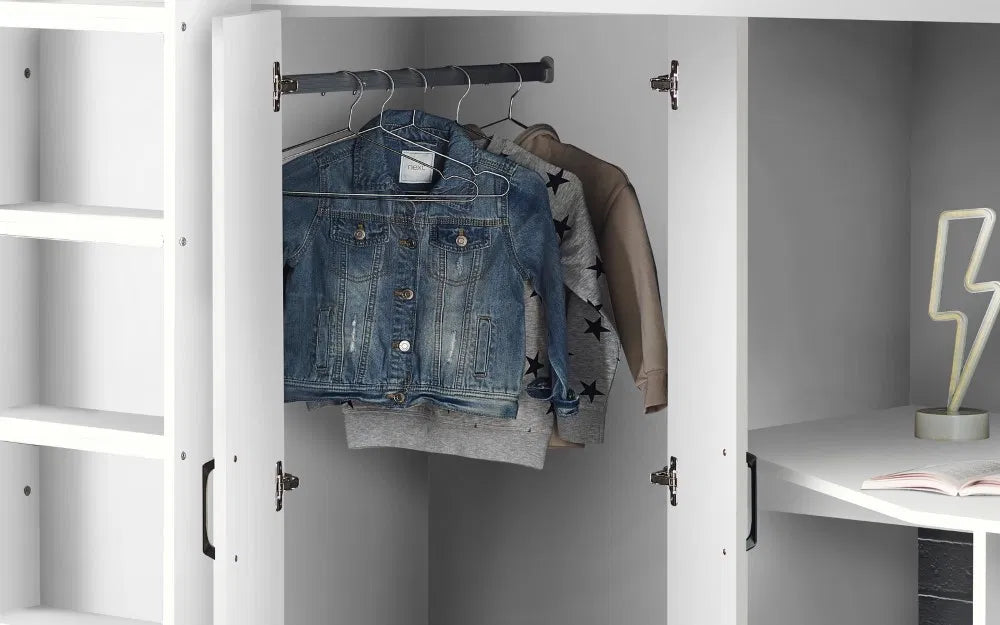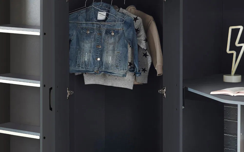 Engineered for optimal functionality, the Thunder High Sleeper is the ultimate choice for your child's bedroom. This versatile bed is designed to maximise space and organisation, featuring an angled wardrobe that offers generous storage for clothing and essentials. The built in shelving is perfect for keeping all their belongings in order, whether it's files, folders, shoes, or gaming gear.